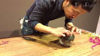 ドラセナの葉っぱを丸めてグラスに沿わせ...