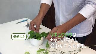 ボール型の花器に緑の葉っぱを活けて、グ...