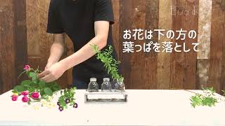 - バラも器に高さを合わせてカットします。下の方の葉っぱは取ります。
